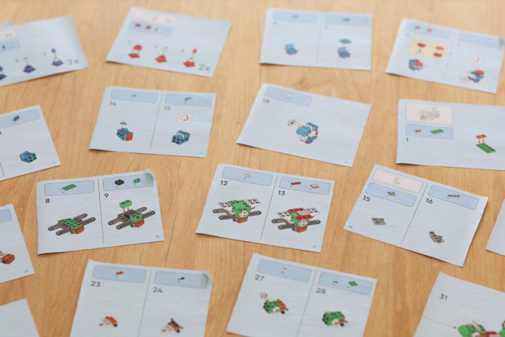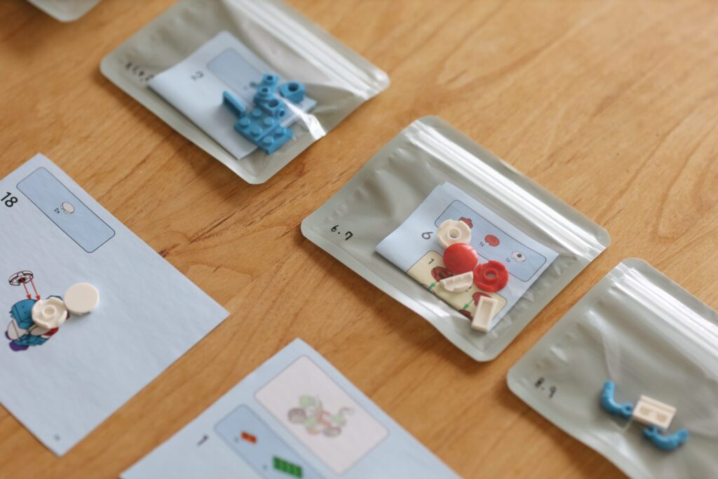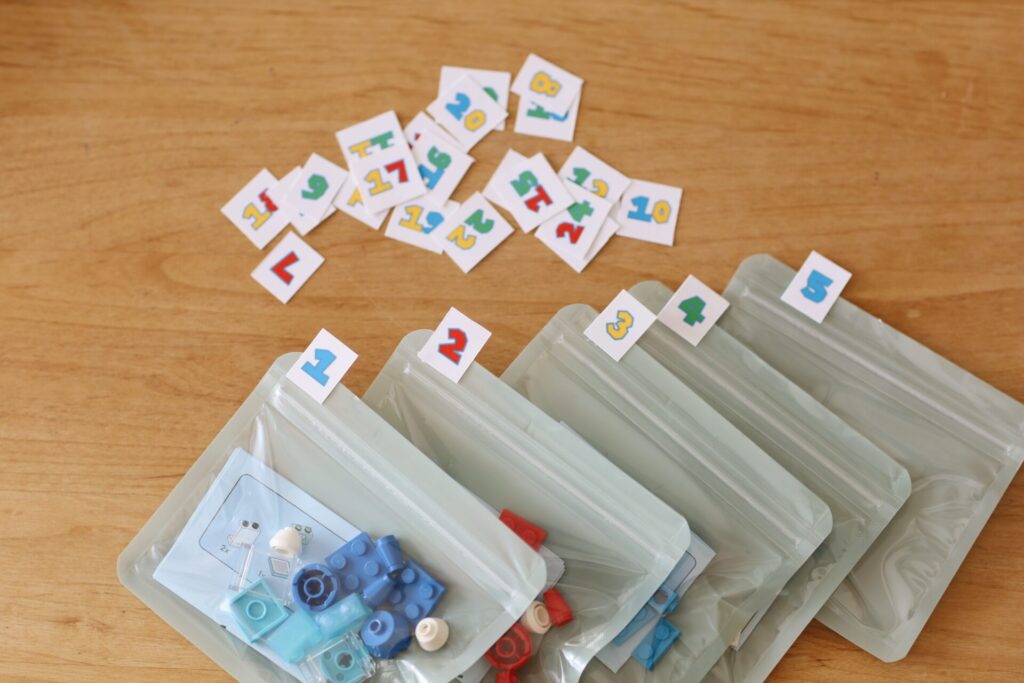 説明書を裏表で日を分ける時は1日目にだけ説明書を入れます。(2日目は前日の説明書を見て作る)今日はどの工程をやるのか分かりやすいように、説明書に書かれた番号を袋に書き込んでおきます。